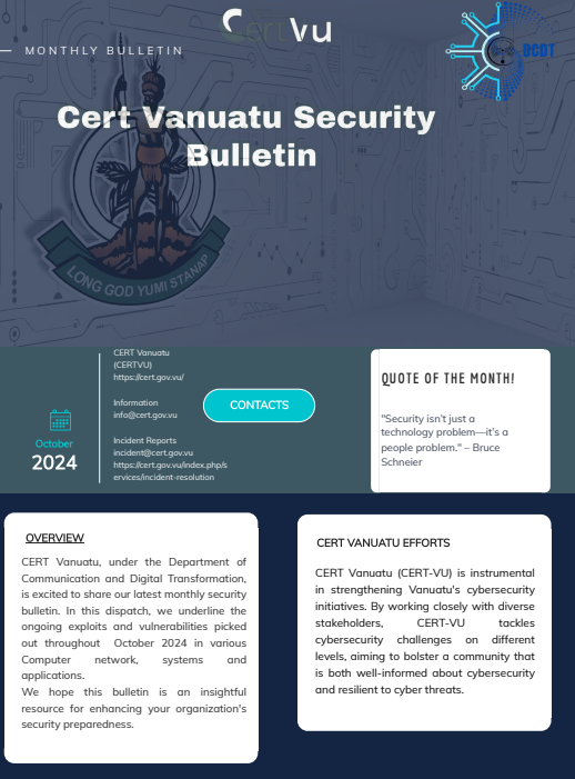 CERT Vanuatu, an operating Unit of the Office of the Government Chief Information Officer, presents this monthly security bulletin. This bulletin states out details on vulnerabilities and active exploits identified throughout the month of September 2024 across various widely used systems and applications. This document is aimed to be used as a valuable resource for enhancing security preparedness within your organization.