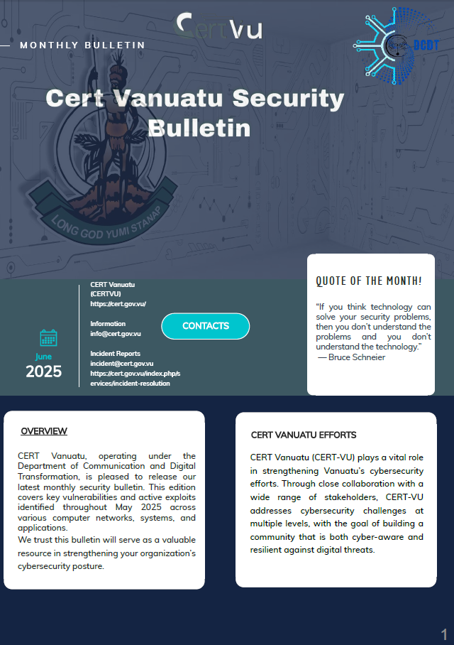 CERT Vanuatu, an operating Unit of the department of Communication and digital Transformation, presents this monthly security bulletin. This bulletin states out details on vulnerabilities and active exploits identified throughout the month of June 2025 across various widely used systems and applications. This document is aimed to be used as a valuable resource for enhancing security preparedness within your organization.