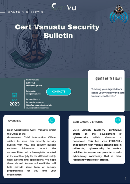 The Computer Emergency Response Team (CERT Vanuatu) under the Office of the Government Chief Information Officer (OGCIO) wishes to share this monthly security bulletin with you.