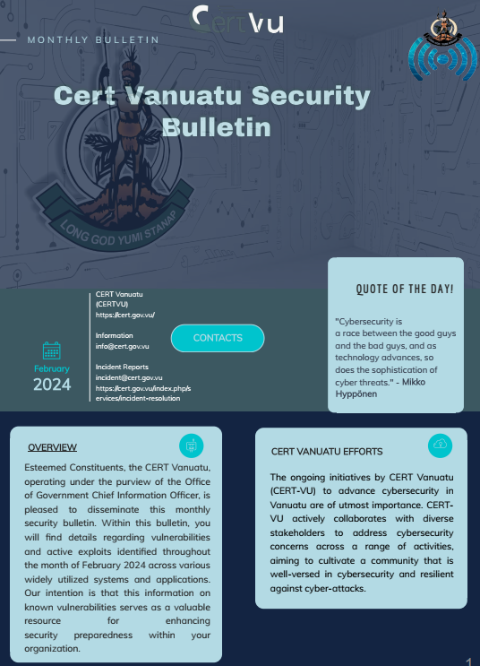 The Computer Emergency Response Team (CERT Vanuatu) under the Office of the Government Chief Information Officer (OGCIO) wishes to share this monthly security bulletin with you.